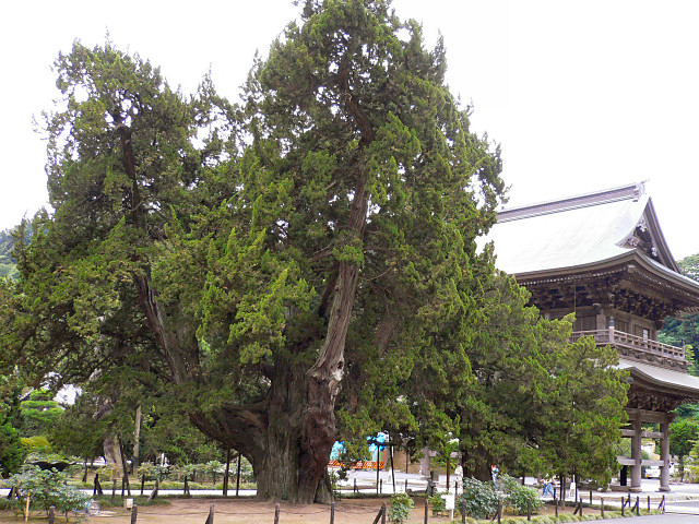 | ● | 建長寺は鎌倉五山第一位で、臨済宗建長寺派の大本山です。 建長5年(1253年)に執権・北条時頼が蘭渓道隆(らんけいどうりゅう)を開山として創建した、わが国最初の禅の専門道場です。 境内全体が史跡に指定されており、伽藍配置は、総門、三門、仏殿、法堂などの主な7つの建物が中軸上に並ぶという中国の禅宗様式の伽藍配置でした。現存する建築物は江戸時代の再建になります。 ビャクシンは三門と仏殿の間にあり、7本が鎌倉市の天然記念物に指定されています。ビャクシンの古木は創建当時のもので樹齢約750年とのこと。最も大きいビャクシンは三門から見て左手から2本目です。ビャクシンの巨樹は禅宗寺院に多くあり、神奈川県湯河原町の「城願寺のビャクシン」も有名です。 この建長寺を訪問する前に訪れた「鶴岡八幡宮の大イチョウ」が2010年3月10日早朝に倒壊してしまいました。すぐに胴切りにして元の場所に植えられましたが、いつの日か元のような大イチョウになることを祈るばかり。 (HP管理者) |