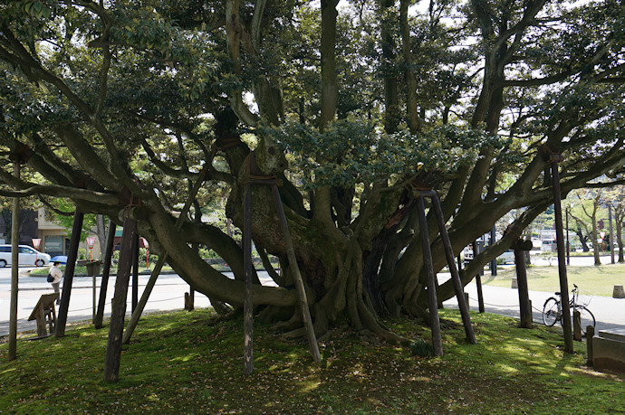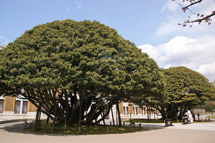 | ● | 「堂形」とは江戸時代の旧県庁周辺の地名です。加賀藩初代藩主・前田利家(まえだとしいえ)が文禄四年(1595年)に的場(弓の練習場)を造らせたといい、その建物が京都東山の三十三間堂を模していたことから「堂形の的場」と称されたのがその始まりとされ、以来このあたりを堂形と称したそうです。 このシイノキの由来については、加賀藩第3代藩主の前田利常の時代の庭園樹という説と、加賀騒動の主役大槻伝蔵の屋敷からここに明治時代に移植されたという説があります。 左右が対となり全く同じ樹形をしています。根元を見ても判別しにくいほどの相似形です。後方にある旧石川県庁舎は1924年に建てられましたが、2003年1月に県庁が市内の鞍月に移転した後は建物を改築し、レストラン・カフェ、会議室、ギャラリーなどの施設がある「しいのき迎賓館」としてリニューアルされました。正面の大正建築と異なり背面は総ガラス張りの現代風になっています。 (HP管理者) |