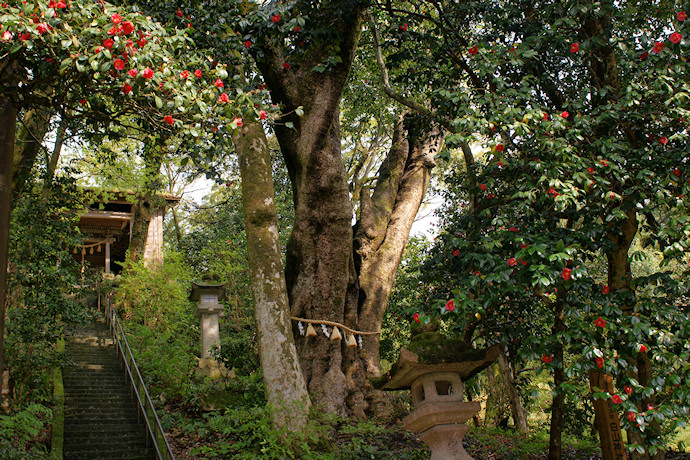 タブノキは参道の石段の右手斜面にあり、地上1mほどで主幹が大きく2本に枝分かれしており、片方は空洞になっているようです。