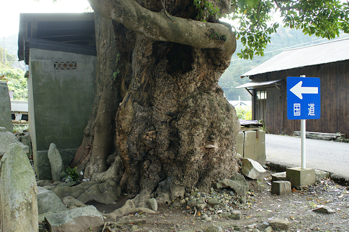 | ●地蔵尊の左横にタブノキがあります。タブノキの左上のガードレールが国道27号線です。 | |