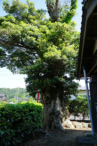 | ●【金山彦神社のタブノキ】(左)上と同じタブノキ。 (右)境内北西端のタブノキ。 | |