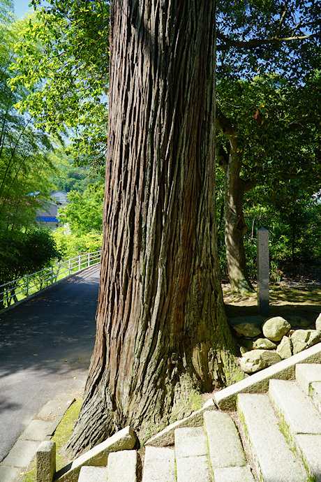 | ●大杉は道路から神社境内に登る石段の左川に聳えています。石段が根の圧力で浮き上がってますね。 | |