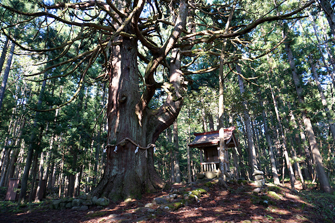 | ●鬱蒼とした杉の林の中に小さな祠と大杉があるので、注意して見ないと見逃してしまいます。 |