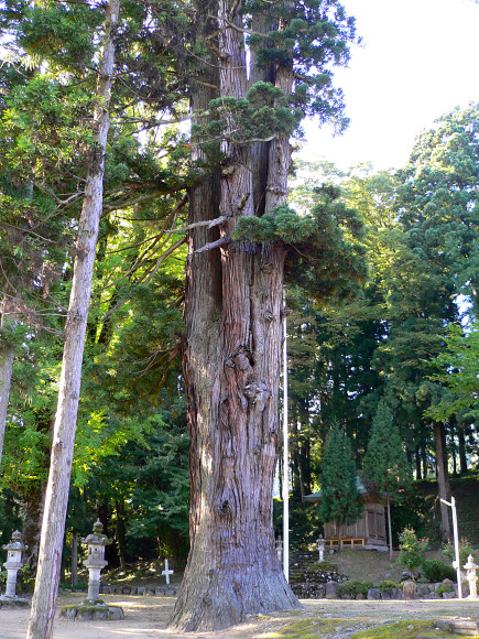 広い境内にはスギの巨樹もあり、これだけでも1ページが作れそう。スギの隣にはもう1本の銀杏もあり、なかなか巨樹揃いの見所多い神社です。神社の前は広いコスモス畑になっていて、満開には少し早くまだ三分咲きでしたが、10月中旬には「のむきコスモスまつり」が行われます。