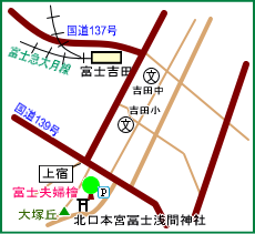| ● | アクセス : 富士急行・富士吉田駅から富士急バス・山中湖方面行きで約5分、「浅間神社前」で下車し徒歩すぐ。 【車】中央道・河口湖ICから国道139号を南東に2.1km、右折し100m。駐車場あり。 | |