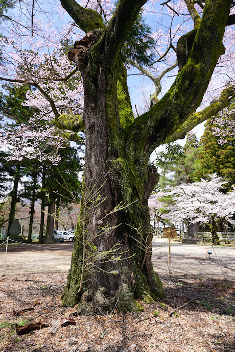 「清秀桜」と同じ愛宕稲荷神社境内に咲くエドヒガンザクラです。説明板などによれば、飯田藩家老安富氏により愛宕稲荷神社に献納された桜で、安富桜の子桜との伝承があります。江戸時代末期に知久町で黒田屋というお店を出していた千代蔵という人が境内の東方、飯田城(長姫城)が眺められる今の地に移植したといわれています。