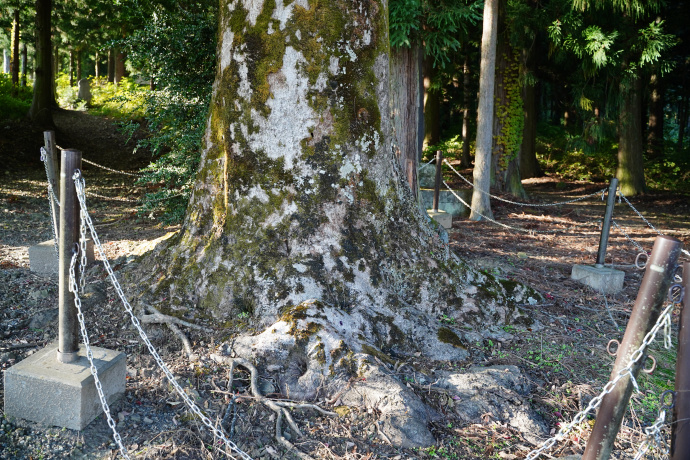 | ●メグスリノキの周囲は鉄鎖がめぐらされています。推定樹齢300年。 | |