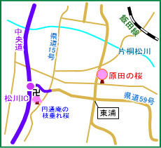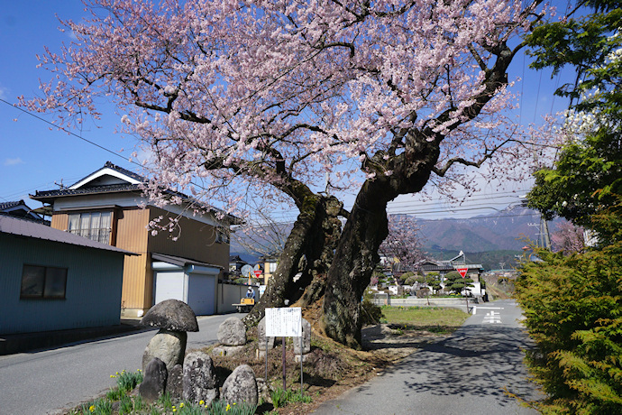 | ● | 原田の桜は道路と道路に挟まれています。現地説明板によれば、 「鎌倉時代に植えられたと思われます。松川町内では最も大きいサクラで、山田家(屋号が原田)の祖先が、土地の北方の魔除けとして植えたといわれています。」 とのこと。 両脇を道路が走り、車の往来も結構あり、余り良い環境ではありませんが、貴重な一本桜として保護に努めていただきたいものです。 近くには「円通庵の枝垂れ桜」があります。 (HP管理者) |