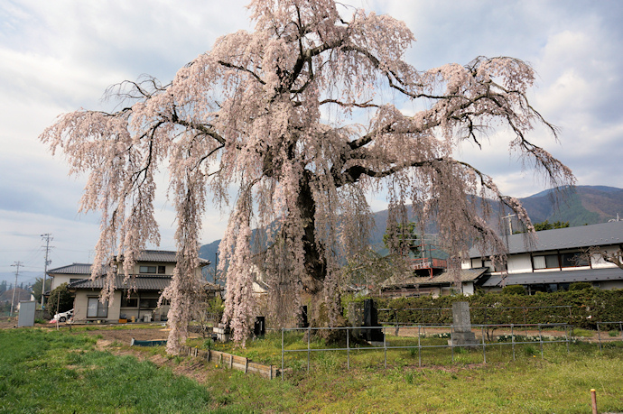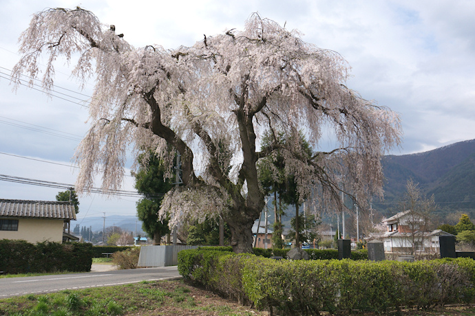 | ● | 本村の大シダレザクラから県道57号を西に行くとこの「堀金三田の枝垂れ桜」が道の両側にあります。北側の枝垂れ桜は道路にまで枝を広げており、道路を通る誰もが美しいこのサクラを鑑賞できます。 もう1本の南側の枝垂れ桜は道路から50mほど離れた草地の中の墓地にあり、地面に着きそうに枝垂れた美しい姿は、安曇野の田園風景を華やかに彩ります。ちょうど満開でしたが、青空が少なくなり、そろそろ天気が怪しくなり始めました。急いで次のサクラに行くことにします。 (HP管理者) |