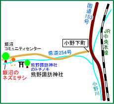 | ● | アクセス : 【車】中央道・伊那北ICから国道153号を北に10.8km、「小野下町」を左折し県道254号を西に2.9km。飯沼コミュニティセンターに駐車しました。 | |