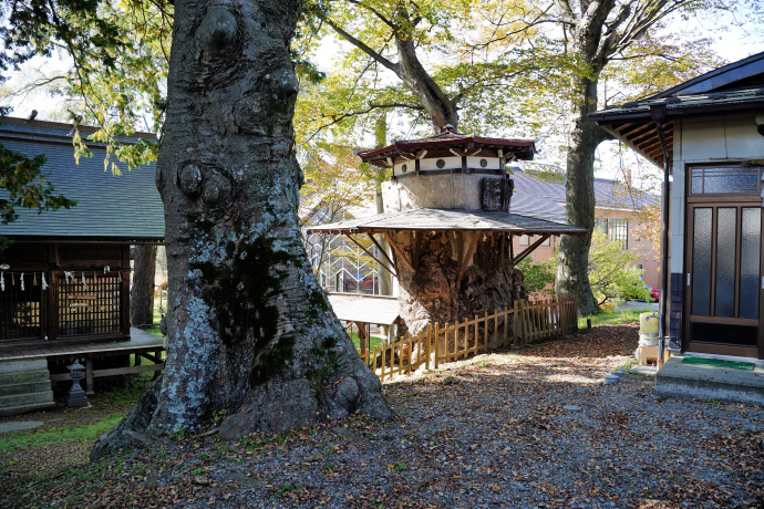 | ● | 葛井神社は温泉施設・温水プールなどを備えた「アクアランド茅野」の南隣にあります。神社の祭神は、水の神様である槻井泉神(つきいずみのかみ)です。創建の年代は不明ですが、古くから諏訪大社の末社であり、前宮とは関わりの深い神社です。 境内には「葛井の清池」があり、元々は社殿もなく、池そのものが御神体とされていました。社殿が建立されたのは明治以降になります。 毎年大晦日には、諏訪大社上社の年中神事の最後を飾る「御手幣送りの神事」が行われます。これは一年神事で手向けられた供物である幣帛や、榊や柳の枝、柏の葉などを御宝殿より取り下げ、葛井神社に運び、寅の刻(午前4時ころ)に葛井の池に投げ入れる神事です。 すると卯の刻(午前6時ころ)には遠州(静岡県)にある「さなぎの池」に浮かび上がると伝えられていて、これは諏訪大社の七不思議の一つと言われています。さらに葛井の池はいつも澄んでいて、「底なし池」、「片目の魚が棲む」など数多くの伝承があります。「さなぎの池」はどこかについては諸説あります。 ケヤキは神社拝殿前の斜面上にあり、まだまだ若いケヤキです。すぐそばには「千本欅」と呼ばれる、かってのケヤキの巨樹が保存されていました。すでに主幹は切られており、大きな屋根と庇が二段に被せられています。幹周は9mぐらいでしょうか。 かっては県の天然記念物に指定されていましたが、落雷や失火により危険になり昭和49年に伐採されてしまいました。いまでは子供のケヤキが根元に育っています。 また葛井の池の池畔にはヤナギの巨樹がありました。主幹は途中で無くなっていますが、幹周4mを超す巨樹です。樹種は「シロヤナギ」とネットにありますが、枝が枝垂れており、シダレヤナギかも。(柳の種類は多くて判別が難しいですね) (HP管理者) |