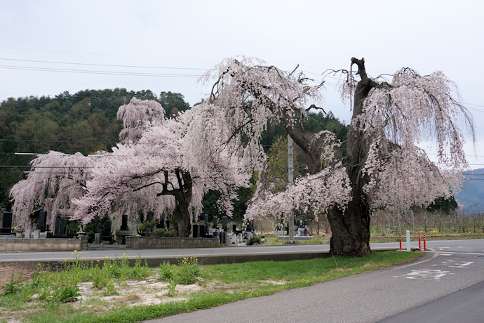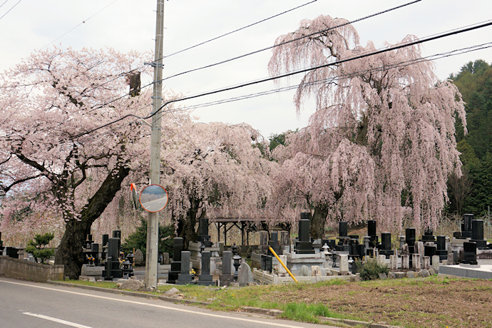 | ●県道25号の南側の墓地には2本のしだれ桜と1本のヒガンザクラがあります。 |