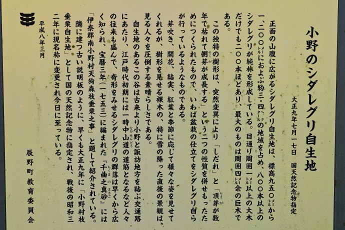 | ●小野枝垂栗自生地の案内板。 説明板では最大樹で幹周約4m。 | |