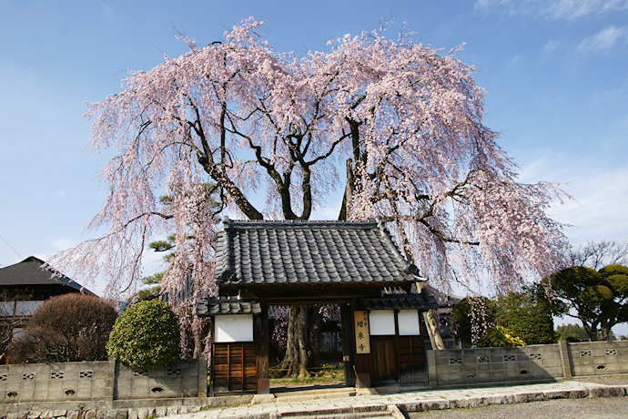 | ●山門の上に天蓋のように枝垂れ桜が覆い被さることから「天蓋しだれ桜」の名があります。 | |