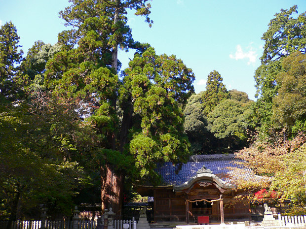 説明板によれば、「関ヶ原の戦いの時、社殿は兵火にかかったが、ご神体は幹の別れたところに安置してあったので安泰であったという。古来より御神木として仰がれている。」とあります。枝張りは東西約10.5m、南北約16mで、樹勢もよく県下でも稀な大木です。