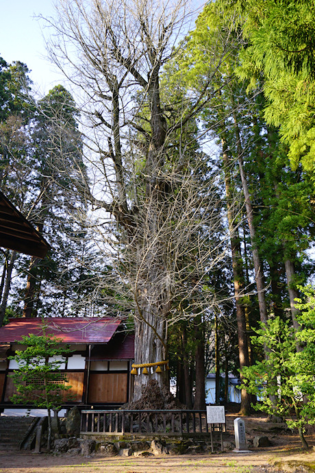 | ●境内の説明板では、地上1.5mでの幹周6. 3m、樹高35m、樹齢千数百年。 | |