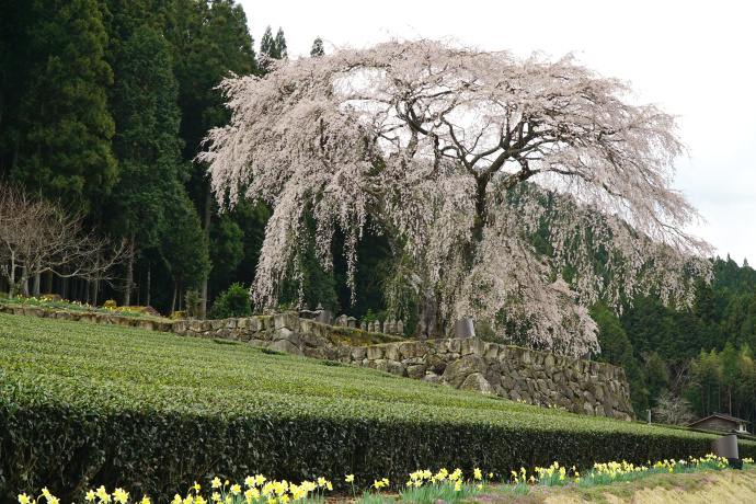 | ● | 県道62号線に入ると「水戸野のシダレザクラ」と書かれた幟(のぼり)が次々と道路脇にあり、現地まで途切れることがありませんので、開花時は迷うことなくこの枝垂れ桜に行くことができます。 「水戸野のシダレザクラ」は、元水戸野庄屋・渡辺家にあった彼岸桜で、毎年4月中旬に開花します。昭和42年に県の天然記念物に指定されましたが、誰にも見向きもされず一度は枯れかけていましたが、地元の人達の手当てにより、新しい幹が増えるなど元気を取り戻しました。 そして平成18年には、中学校で使われていた古い水銀灯を使用し、見事な夜桜を披露できるようになりました。次第に人気が高まり、今では多くの観光客が訪れる白川町の桜の名所となりました。 訪問した日は満開を若干過ぎていたようですが、それでも枝の先まで花が咲いていました。シダレザクラの周囲にはお茶畑が広がっており、ここは美濃白川茶の産地としても有名です。 美濃白川茶(しらかわちゃ)は、白川町と東白川村を中心に栽培されるお茶で、東白川村が発祥地です。伝承では、室町時代、蟠龍寺(今はありません)の住職が、茶の苗を京都の宇治から持って帰り、村人に栽培を広めたのが白川茶の始まりといわれています。 海抜400~600mと高い標高に位置する白川の茶園では、新芽が育つ4月~5月頃の昼夜の温度差が大きく、葉がゆっくりと成長する上、朝、川から立ち上る霧がベールとなって葉の乾燥を防ぐため、質の良いお茶が育つそうです。 近くには「水戸野のオオカキ」、「広野の大カヤ」があります。 (HP管理者) |