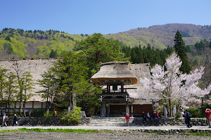 | ● | 明善寺は真宗大谷派の寺院で、創建は延享元年(1744年)です。明善寺は白川郷荻町合掌集落の北側に位置しており、本堂・庫裏・鐘楼門とすべての屋根が茅葺きという珍しい合掌造りのお寺です。庫裏・鐘楼門は県文化財、本堂は村文化財に指定されています。 明善寺は白川郷合掌造り集落の中心部にあり、観光客がとても多い場所です。世界遺産になっているからでしょうが、大型観光バスで団体客がわんさと来るので、集落内は中国語などの外国語が飛び交い、とても静かな山里の気分は味わえませんでした。 イチイの木は県の天然記念物で、文政10年(1827年)本堂再建の折に副棟梁の大工与四郎が植えたとされています。近くの本覚寺には菊桜の「おおた桜」がありますが、まだ蕾で10日程早いようでした。明善寺のすぐ南には「白川八幡神社のスギ」があります。 (HP管理者) |