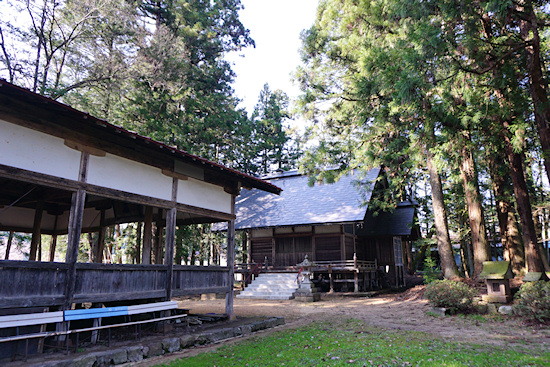 ●二之宮神社神楽殿(左)と拝殿・本殿。 |