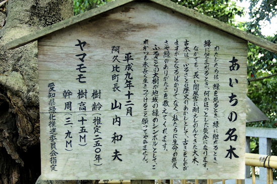 | ● | 境内の説明板によれば、,祭神は、応神天皇、神功皇后の二柱で、草木地区の氏神様です。創建は室町時代の康正元年(1455年)で、永禄2年(1559年)に再建されています。 現社殿は平成元年に建て直されたコンクリート造りです。永禄3年に前田利家が桶狭間の合戦の勝利と我が身の運の良かったことを感謝し、刀1振りと幡1片を寄進したとあります。そういえば桶狭間の古戦場はわりと近いですね。(直線距離で10km程) ヤマモモはかなりの古木で、樹の前にあった「あいちの名木」の説明板では樹齢250年となっています。幹には大きな空洞が何カ所もあります。竹柵で保護をしており、これからも生き続けて欲しいものです。 (HP管理者) |