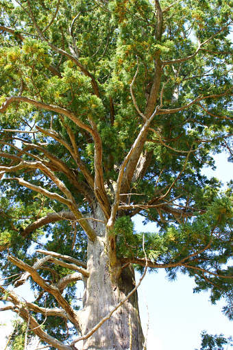 | ●目の神様といわれる諏訪神社境内にそびえている。大杉の下部5メートルほどは枯れ枝が多い。 |