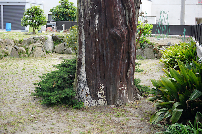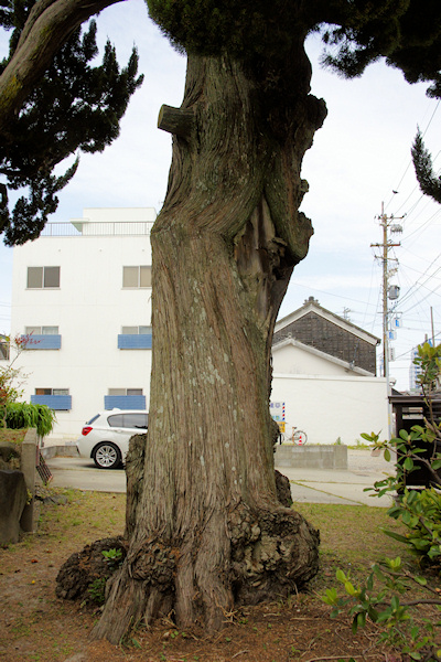 | ● | 常滑市大野町の古い建物やお寺が並ぶ旧街道沿いから少し入った所に「大野町のイブキ」がありました。個人宅の裏庭にありますが、駐車場から見ることができます。お宅の前にもイブキの巨木がありました。 昭和28年の13号台風、昭和34年の伊勢湾台風によってかなりの被害をうけたものの、その後樹勢は回復しているとのことですが、大分枝が少なくなっています。 樹齢約680年といわれ、長く大野地方の大庄屋を務めた家の庭にあり、徳川家康も2度滞在し、この木を称賛したと伝えられています。このイブキは、県指定天然記念物となっている知立市の「万福寺のイブキ」及び安城市の「本證寺のイブキ」に比較しても勝るとも劣らない県内屈指のイブキの巨樹とあります。 (HP管理者) |