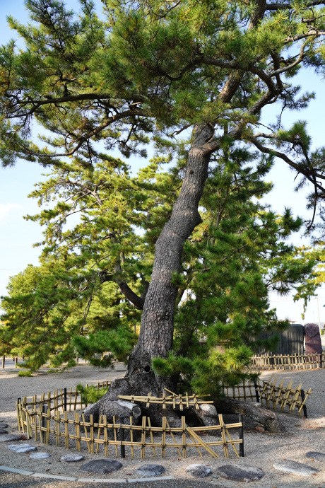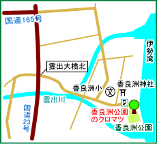 | ● | 津市香良洲町は雲出川(くもずがわ)河口に位置し、東に伊勢湾を望む典型的な三角州にできた町です。市町村合併前は三角州全体が香良洲町でした。国道23号から東に香良洲神社を過ぎると、右手に公園駐車場があります。 古くは「香良洲神社」の神領地だったこともあり、公園の中には立派な松が何本も植えられ、美しい景観を作っています。総面積は約4.5ha。ただやはり虫害によりその数を減らしつつあるようです。 最大樹とおぼしきマツは、公園の東端、伊勢湾の防波堤近くの広場にあり、幹周実測値/4.62mでした。 古い伝説もあります。 大同2年(807年)東北に向かう途中の征夷大将軍・大伴弟麻呂(おおとものおとまろ)は、戦勝を祈願して神宮に参拝しますが、台風で一時香良洲浦に避難。この時、地元の香良媛が舞楽でもてなしました。将軍はかぶら矢を立てて再会を約束して出発しましたが、矢を立てたところが、野原だったので、香良洲町の前の旧村名の矢野村になったといいます。 更に将軍が馬をつないだマツがあり、これを「駒繫(こまつなぎ)松」といって海岸にありました。しかし、この古松は宝永4年(1707年)の富士山噴火にともなう地震津波で根が洗われ、寛延4年(1751年)頃枯死したといいます。(三重の巨樹・古木より) (HP管理者) |