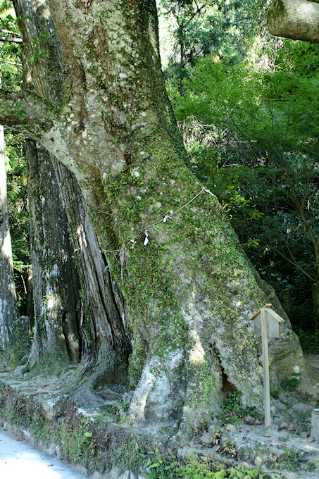 | ●拝殿右手の斜面にあるクスノキの巨樹。根が雄大です。 |