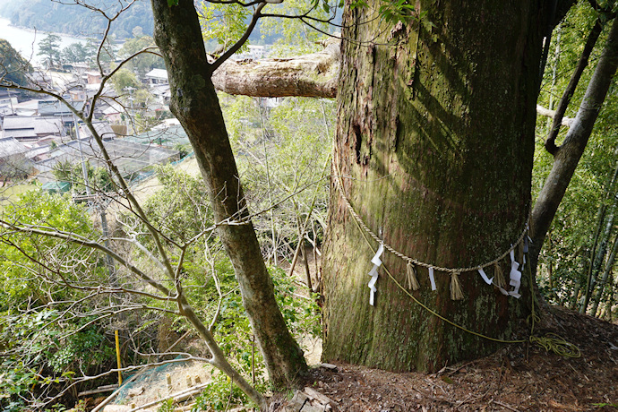 | ● | 境内にある由緒書きでは、元は三木里にあり、享保7年(1722年)に現在地に鎮座されたことが棟札で分かります。海岸にあった社殿は宝永4年の大地震と大津波により流されました。また近世までは貴布禰神社と呼ばれていたそうです。当社の創祀については、詳細は不明ですが、元和元年(1165年)には三木里浦に御殿造営の記録があり、それ以前の創始であることが推定されます。 神社に行くには神社の駐車場がないので、海岸の公園駐車場に車を駐車し、紀勢本線の鉄橋を渡り石段を登ります。集落のどこからでも神社が見えますが、参道にたどり着くのが大変です。大杉は石段の左手の急斜面にあり、下の方の枝は折れています。また石段右手の樹木がほとんど最近切られたようで、鎮守の森が寂しくなってしまいました。結構大きな切り株もあります。 駐車場のある海岸の公園には「三木里海岸のクロマツ」があります。 (HP管理者) |