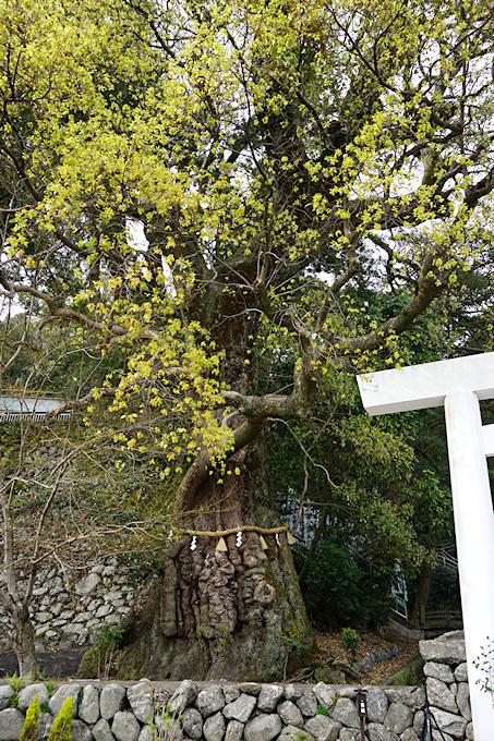 大クスは神社参道の左手にあり、長い年月を経た証拠である深い縦しわが入り、その樹瘤は「安らかに眠る赤ん坊の寝顔」のように見えると言われています。うーん、どちらかというと、おじいさんの皺にも見えるなー。かなり急な斜面に生育しており、環境省巨樹巨木林DBの幹周はどこを測ったのかな。
