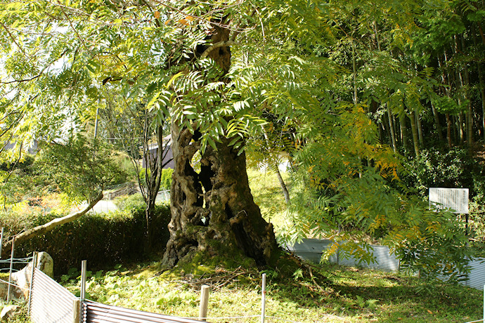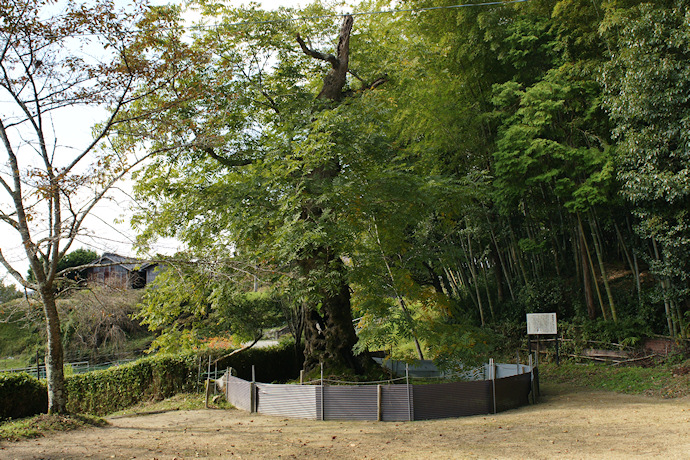ムクロジは伊賀の乱後に植えられたとされます。樹齢400年といわれ、幹は空洞だらけ。樹皮だけで生きているようです。畑仕事をされていた近所のおばあさんに聞くと、そう長生きできないことを見越しそばに後継樹を育てているとのこと。