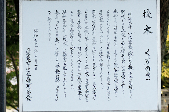 | ●「校木」として大切にされています。保護樹林説明板に傍には「校木」の説明板もありました。 |