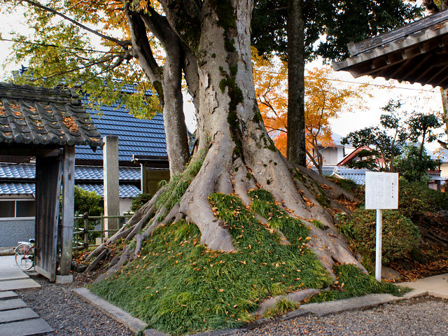 | ● | 雨森芳洲庵(あめのもりほうしゅうあん)のケヤキは前回紹介した「天川命神社のイチョウ」から50mも離れていません。雨森芳洲(1668〜1755年)は、江戸時代中期に儒学者として、また対馬藩に仕え朝鮮との外交に活躍した人物として歴史に登場します。ここはその芳洲の生誕地です。 ケヤキは芳洲庵の門前に立っていて、門前には小川が流れ、水車が回っています。雨森地区には多くの水路がめぐらされており、水路にはいくつもの水車とともに花をいっぱい飾っています。観光地としてはそんなに有名ではないけれど、ゆったりとした時間の流れを楽しめる場所です。 渡岸寺の十一面観音像とともに旧高月町観光の目玉でしょう。 (HP管理者) |