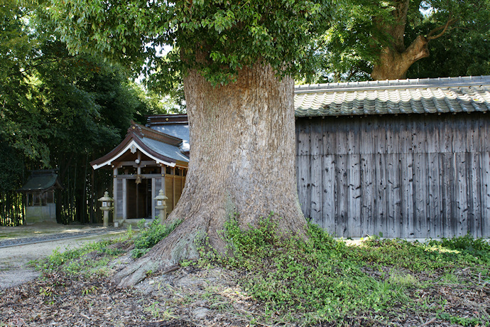 | ● | 境内の説明板によれば、祭神として布留大神(ふるのおおかみ)を祀ります。創祀年代は不詳ですが、社伝によると、天照大神の十員の神を祀るとも言われ、延宝7年(1679年)正月に社殿再建するとあります。 湖西の地には珍しいクスノキの巨樹で、境内には幹周3mを超すクスノキが他にも2本ありますが、このクスノキが幹周が飛び抜けて大きく、根張りもよく、これからもさらに大きくなりそうです。 近くには藤樹神社のタブノキや中江藤樹記念館があります。 (HP管理者) |