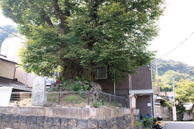 | ●根が露わになった犬塚のケヤキ。幹周/3.8m、樹高/10m、樹齢/600年。 | |