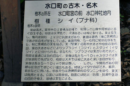| ● | 水口神社は祭神として大水口宿禰命(おおみなくちすくねのみこと)を祀ります。大水口宿禰命は饒速日命(にぎはやひのみこと)の6世の孫で、郷土を開拓された祖神とされます。神社の草創は不詳ですが、日本三代実録の貞観元年(859年)正月甲申の条に「従五位下水口神に従五位上を授く」とあり、延喜式内の旧社で、神名帳にある近江国155座甲賀郡8座の一つといいます。 水口神社の祭礼行事である「水口曳山祭(みなくちひきやままつり)」は享保20年(1735年)に始まった華麗な曳山が有名で、町内に現存する山鉾は16基あり、例年4月20日に例大祭として行われます。 シイの巨樹は、鳥居を入った左手にあり、古木らしく深いしわを持って立っています。環境省巨樹巨木林DBではツブラジイとしていますが、スダジイとの区別は実の大小くらいでなかなか区別しにくいと説明板にありますのでここでは単に「シイ」としました。頂部に枯れ枝があり、根元にも空洞があるようで、ちょっと心配です。 (HP管理者) |