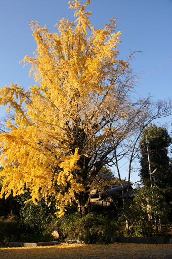東門院は旧中山道に沿っており、旧中山道を西から進むと写真のように正面にイチョウの黄葉を見ることができます。イチョウのそばには鎌倉時代の三基の石造宝塔があり歴史の古さを偲ばせます。