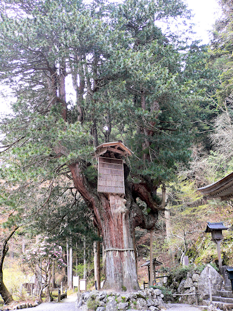 | ● | ゴールデンウィーク連休の初日、貴船神社(相生杉とカツラを紹介)から車で芹生(せりょう)峠を越えて花脊(はなせ)から広河原の峰定寺(ぶじょうじ)を訪ねました。お寺の受付でカメラなど荷物はすべて置いて、杖と袋を持ってにわかに修験道の行者に変身し、急な坂道を大悲山中腹の本堂(重文)に登ります。 丁度正午でしたが観光客は誰もいません。途中には大杉(幹周/5.32m)がありますが、カメラを受付へ置いてきているので写真は撮れませんでした。(仁王門から先は撮影禁止です。) 大悲山(だいひざん)・峰定寺は、大峰熊野の修業者・観空上人が鳥羽法皇の帰依を受けて、久寿元年(1154年)に創建された修験道の寺院です。大悲山本堂は清水寺本堂のような舞台懸崖造りで仁王門とともに室町時代前期の建築です。 コウヤマキには「神木」との表示があり、折れた主幹には覆いの小屋根がつけられています。すごい山奥なのですが、お寺の駐車場の前には高級料亭が何軒かあります。この山深い修験道のお寺には何か不似合いな感じですが。さて30分ほどのつかの間の短い修験道の体験を終えて、ここから徒歩約20分かけ次回紹介する「大悲山の三本杉」に向かいます。 車で来る途中、小集落・八桝町の道路沿いに「春日神社のイチョウ」がありました。まだ若葉も見られませんが幹周5m近い巨木です。京都バス「春日社前」停留所のすぐそばにあります。 (HP管理者) |