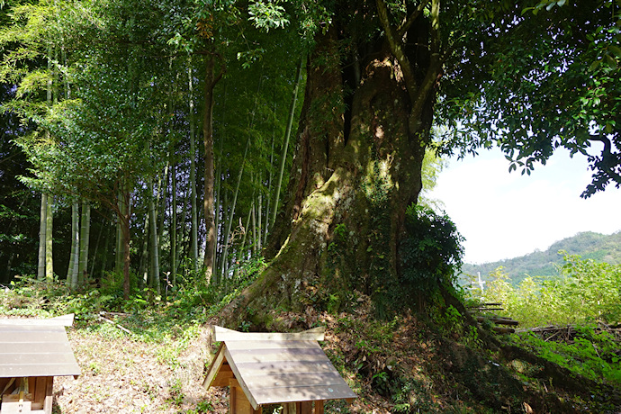 | ●ツクバネガシの後方に見える御霊神社の本殿は、覆屋で覆われています。 | |