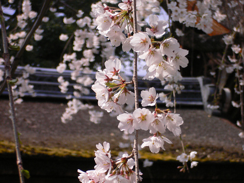 魁(さきがけ) 平野神社の代表的品種で、早咲きの枝垂れ桜です。神社の神門すぐ手前にあります。写真後方の屋根が神門です。※3 |
