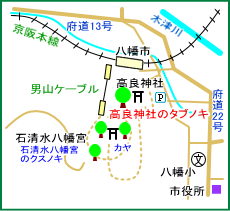 | ● | アクセス : 京阪電車・八幡市駅で下車、駐車場の後に神社はあります。 【車】国道1号「八幡一ノ坪」交差点を八幡市役所方面へ、八幡市役所を過ぎて、正面つきあたりの京阪電車「八幡市駅」ロータリー手前を左折すると駐車場です。 | |