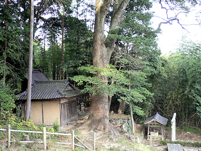 | ● | 京都市の西にある西京区大原野石作町の八幡宮社(やはたぐうしゃ)は、長峰八幡宮とも呼ばれており、祭神として応神天皇(おうじんてんのう)、天照大神(あまてらすおおかみ)の二神を祀ります。石垣の上にある本殿と拝殿は、横穴式古墳といわれる石室上に建っています。石室がどこなのかは分かりませんでしたが。 町名の「石作(いしづくり)」とは、古代の豪族・石作氏がこのあたり大原野を支配していたことからで、石作氏は古墳などに納められた石棺を作っていたそうです。 大楠は本殿に向かって左側の石垣の上にあり立派な根元が特徴です。 (HP管理者) |