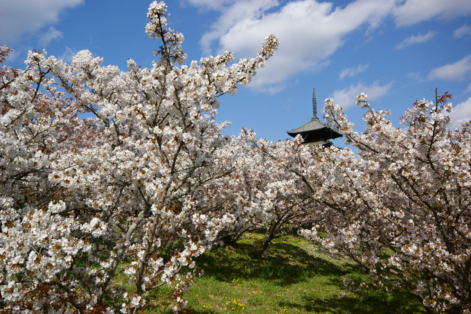 | ●御室桜は国指定名勝で、指定名は「御室(さくら)」です。五重塔と御所桜は定番のショット。 |