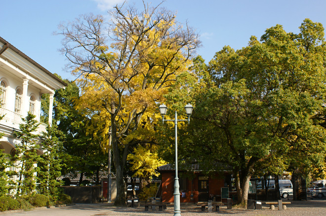 | ● | 今回の目的は西本願寺境内にあるイチョウでしたが、阿弥陀堂前のイチョウは写せたものの御影堂前の大銀杏はまだ修復工事の囲いがされており、逆光でしか撮れない状態でしたので再度挑戦ということにして、すぐそばにある龍谷大学大宮学舎のイチョウを写しに行きました。 日曜日で学生さんの姿はなく、観光客が4・5人いるのみ。守衛さんにイチョウの写真を撮ることの断りを入れてから撮影に入りました。この龍谷大学大宮キャンパスの本館および南黌(なんこう)・北黌(ほくこう)・旧守衛所・正門などは、明治12年(1879年),龍谷大学の前身である西本願寺大教校(だいきょうこう)の施設として建てられました。現在の本館は旧大教校の講堂で、1879年に竣工した和洋折衷の擬洋風建築です。 イチョウは、明治初期の開校の時に、すでに大木として存在していました。西本願寺の境内のイチョウと比べるとやや小振りですが。校舎は明治の雰囲気が香り、京都観光スポットの中でも異色な存在です。イチョウよりも明治初期の建築美を撮る方に気持ちが動いてしまいました。 (HP管理者) |