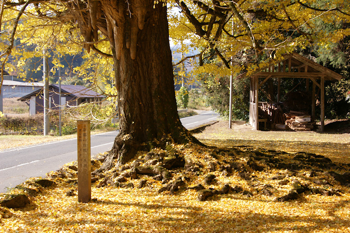 | ● | 車で県道を走っていると1.2mほどの石垣の上に道路を覆い被さるようなイチョウの大樹が眼に入ってきます。訪問時はイチョウの葉の多くがすでに落下しており、境内は黄色いイチョウ葉で覆われていました。又根元は根上がりをして周囲に広がっています。京都の自然200選に選出されており、夜久野の黄葉の名所になっています。 由緒など詳しいことは不明です。 (HP管理者) |