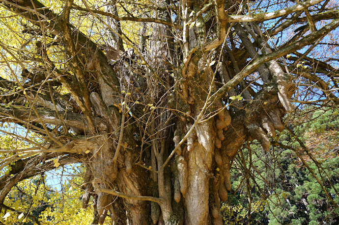 | ●イチョウには多くの乳(気根)が垂れ下がり、奇怪な樹形を作っています。 | |