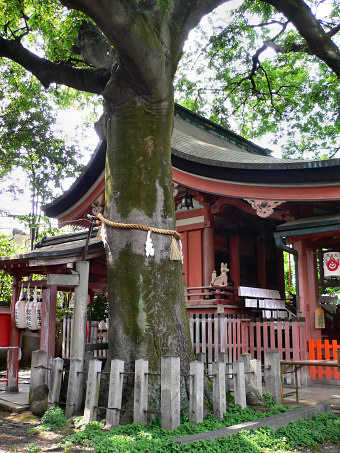平安時代末期、平重盛(たいらのしげもり)が安芸の宮島・厳島神社から苗木を移したと伝えられる榎の巨木で、樹齢約850年とされています。末社「宮姫社」の弁財天が宿るといわれ、エノキにふれた手で体をさすると病気が治るとのこと。また榎は「えんの木」と呼ばれることから縁結び、恋愛の神として崇敬を集めています。