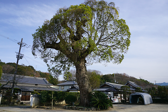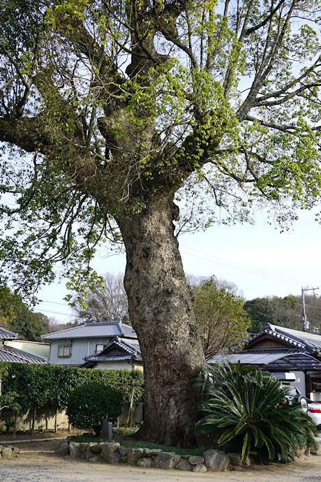 | ● | 「松尾寺」バス停から南に150mほど行くと四つ角になり、左へ行くと松尾寺(まつおでら)という場所に宝瓶院があります。天台宗の寺院で松尾寺の塔頭(たっちゅう)になります。松尾寺には、近世までは13の子院がありましたが、宝瓶院と明王院の2院以外はなくなってしまいました。 宝瓶院境内には幹周6m以上のこの大きなクスノキがあるのですが、バス停横の大阪府の天然記念物に指定されている「松尾寺のクス」が幹周12mもあるので、だいぶ損をしています。 クスノキは幹周の割には樹高が低く、また心なしか葉の密集度も低いようです。天然記念物などの指定はありませんが、大阪府では貴重な巨樹ですから大切にしていただきたいものです。松尾寺境内には「松尾寺のヤマモモ」が、近くの春日神社には府天然記念物のツバキ・マキがあります。 (HP管理者) |