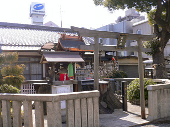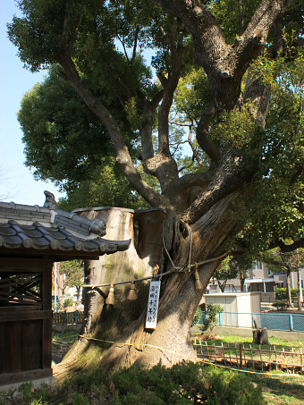 | ● | 蒲田(かまた)神社の祭神は、宇賀御魂神(うがのみたまのおおかみ)、別雷大神(わけいかづちのおおかみ)の二神です。由緒書きでは、別雷大神は藤原時代前期、播磨の室明神に上賀茂社の分霊を船で届ける際、つむじ風に遭い当地に風待ちをしたことから、その縁で当社にも勧請したという古伝が伝わっています。 室町・江戸時代は字名の室から「室の社」とも称しましたが、明治になり大字の「蒲田」から「蒲田神社」となったそうです。明治・大正頃までは楠、杉、松の大木が茂り、境内も薄暗かったそうです。今でも千年樟をはじめ何本かの大木が残ります。 本殿右には白光社があり、樹齢650年以上といわれる大楠の切り株が安置されています。白光社は稲と水の神様で、切り株上に巳(み)さんを祀る小さな祠をのせています。 御本社背後の千年樟は樹齢千年と伝えますが、三本に分かれた幹のうち中央の主幹は途中で失われており、左右の支幹が伸びています。最近大クスの周りに柵をめぐらし保護に努められているようで、もっと多くの葉を茂らせて欲しいものです。市保存樹などの指定はないものの、新大阪駅にほど近い都会の中にあって貴重な緑の空間です。 (HP管理者) |