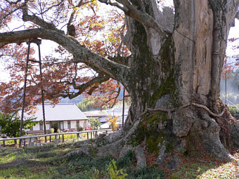 | ● | 説明板によれば、この大ケヤキのある地はかって「蟻無宮」とよばれた神社の境内であったそうです。そしてこの大ケヤキはその神社の御神木であったと考えられています。神社は鎌倉時代中期の承久2年(1220年)の創始と伝えられており、明治に至り野間神社に合祀されたそうです。伝承では、里人は大ケヤキの春先に出る新芽の出具合でその年の豊凶を占ったそうです。 能勢町では大ケヤキのすぐそばに「けやき資料館」を建てており、駐車場・ベンチ・トイレを整備し、町のシンボルにしています。 「野間の大ケヤキ」は、大阪府では以前に紹介した「三島神社の薫蓋樟」に次ぐ幹周の大きさを誇ります。「新日本名木100選」や「大阪みどりの百選」にも選ばれており、山形県の「東根の大ケヤキ」と並ぶ日本の代表的なケヤキの巨樹です。 春に訪れた時は連休前で若葉がとっても美しい時で、資料館の館員の方も1年でも最も美しい時期ですよと言っておられました。 (HP管理者) |